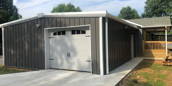This customer wanted to a garage attached to his already existing residence. With a 26×30 he is comfortably able to fit a couple cars and have space for shop, storage, and or workshop. He chose to section off his 780 sq ft garage and have a 10X8 garage door on the front for easy access for a car to pull in along with an additional 10X8 garage door to store larger equipment and materials. The customer also aesthetically decided to with our popular Charcoal Gray color to match his home with the Solar White trim to match. He also went with the full gutters and downs package to carefully navigate rain flow out of his new yard and driveway.